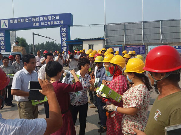 7月6日,第三、第十工程公司承建的邯鄲商貿(mào)城項(xiàng)目,迎來了邯鄲市委、市政府、市總工會組成的慰問團(tuán)。慰問團(tuán)一行向奮戰(zhàn)在施工一線的廣大干部職工發(fā)放了夏季慰問品??偣飨诂F(xiàn)場發(fā)表了熱情洋溢的講話,高度贊譽(yù)達(dá)欣是一支過硬善戰(zhàn)的施工隊(duì)伍,并勉勵(lì)全體參戰(zhàn)人員鼓足干勁,保證工程按期封頂,按期交工。