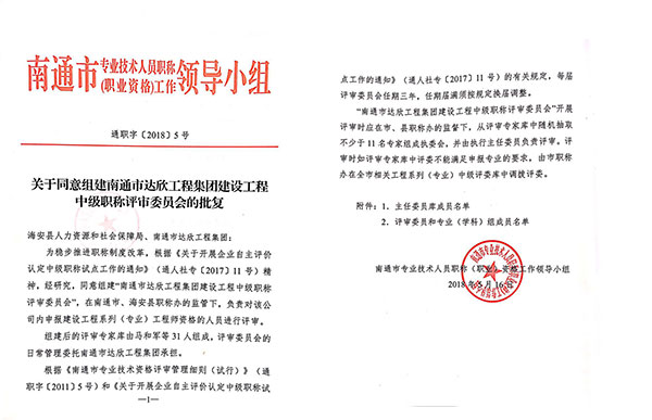 自2018年起,達欣集團將在縣、市職稱辦的領導下,自主對本公司內申報國家級建設工程系列(專業(yè))工程師資格的人員進行評審。只要符合中級職稱申報條件,均可在南通職稱網通過“南通市達欣工程集團建設工程中級專業(yè)技術資格評審委員會”進行申報。此次公司獲得中級職稱自主評價認定資格,既是上級主管部門對公司人才管理工作的肯定,也是公司近年來重視實施人才戰(zhàn)略,加快人才引進與培養(yǎng),企業(yè)技術人員綜合素養(yǎng)水平能力不斷提高的有效體現